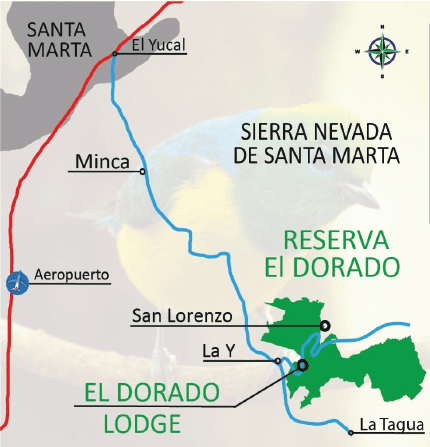 Reserva Natural El Dorado, El Corazón del Mundo a sus pies. Así es la experiencia de la Sierra Nevada en El Dorado. La Reserva El Dorado se encuentra ubicada sobre la Cuchilla de San Lorenzo en la Sierra Nevada de Santa Marta, en el corregimiento de Minca, perteneciente al municipio de Santa Marta , departamento del Magdalena, Colombia, entre 1.900 y 2.600 metros de altura.